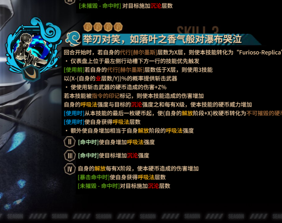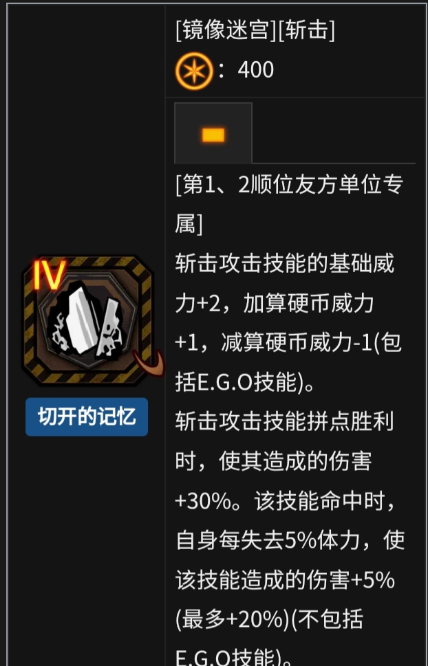 别的就先不说了,就看忧郁3技能和闪避我就知道这肯定又是镜牢单通大手子,再看特殊三技能足足有9个硬币,拿到切开的记忆就相当于加11最终威力,牢里又不缺沉沦和呼吸,特殊三技能的9币和普三的4币打对面身上我都不知道伤害得有多高,已经开始期待了