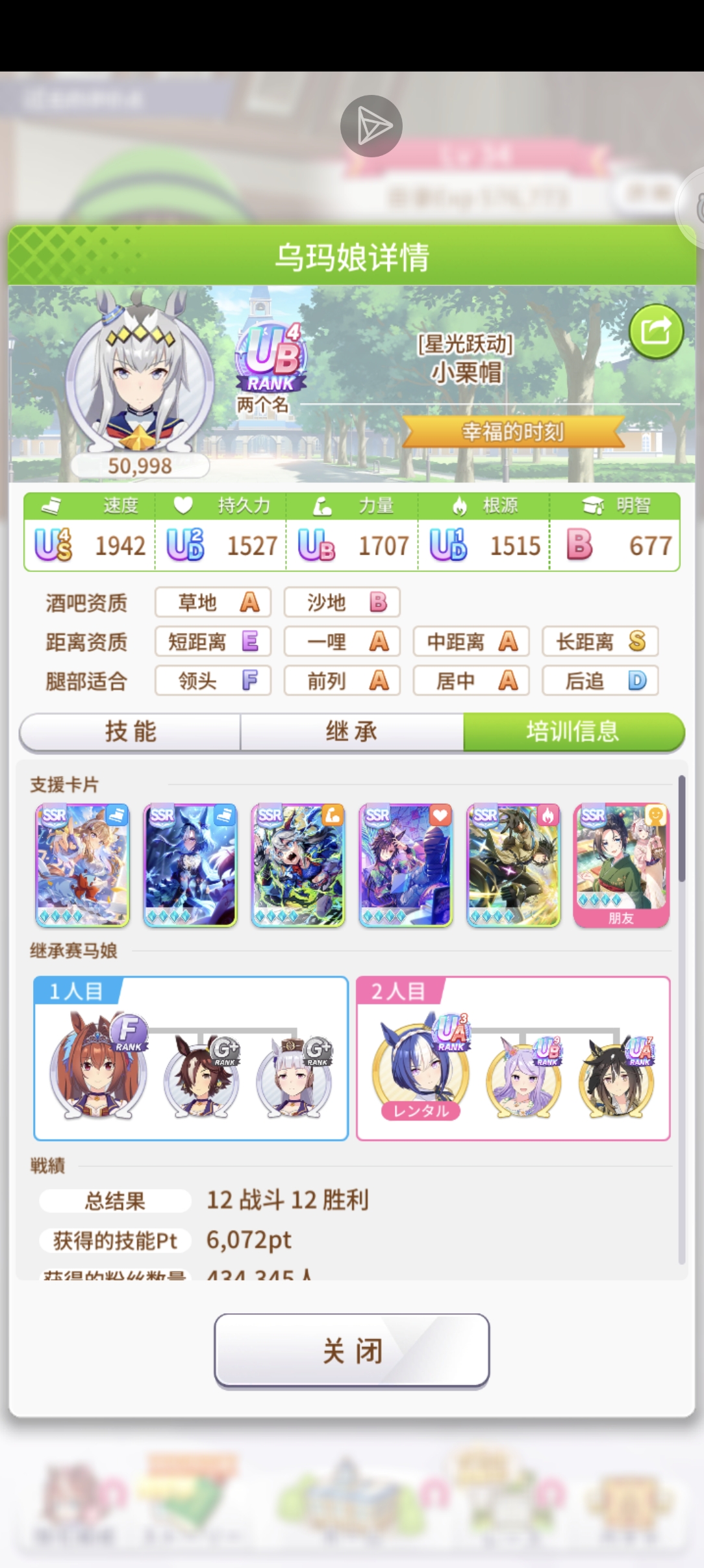 养成马练度低了(马娘星级,突破,技能等级),pt点少了(要是训练协助卡太散去多跑跑比赛),温泉顺序应该要调整一下,种马太差了,五匹相性好的马互怼,尽量18速(就养出来的马和养这匹我是云南的两个种马都是3速,五匹互怼养出两匹)其他的交给运气
