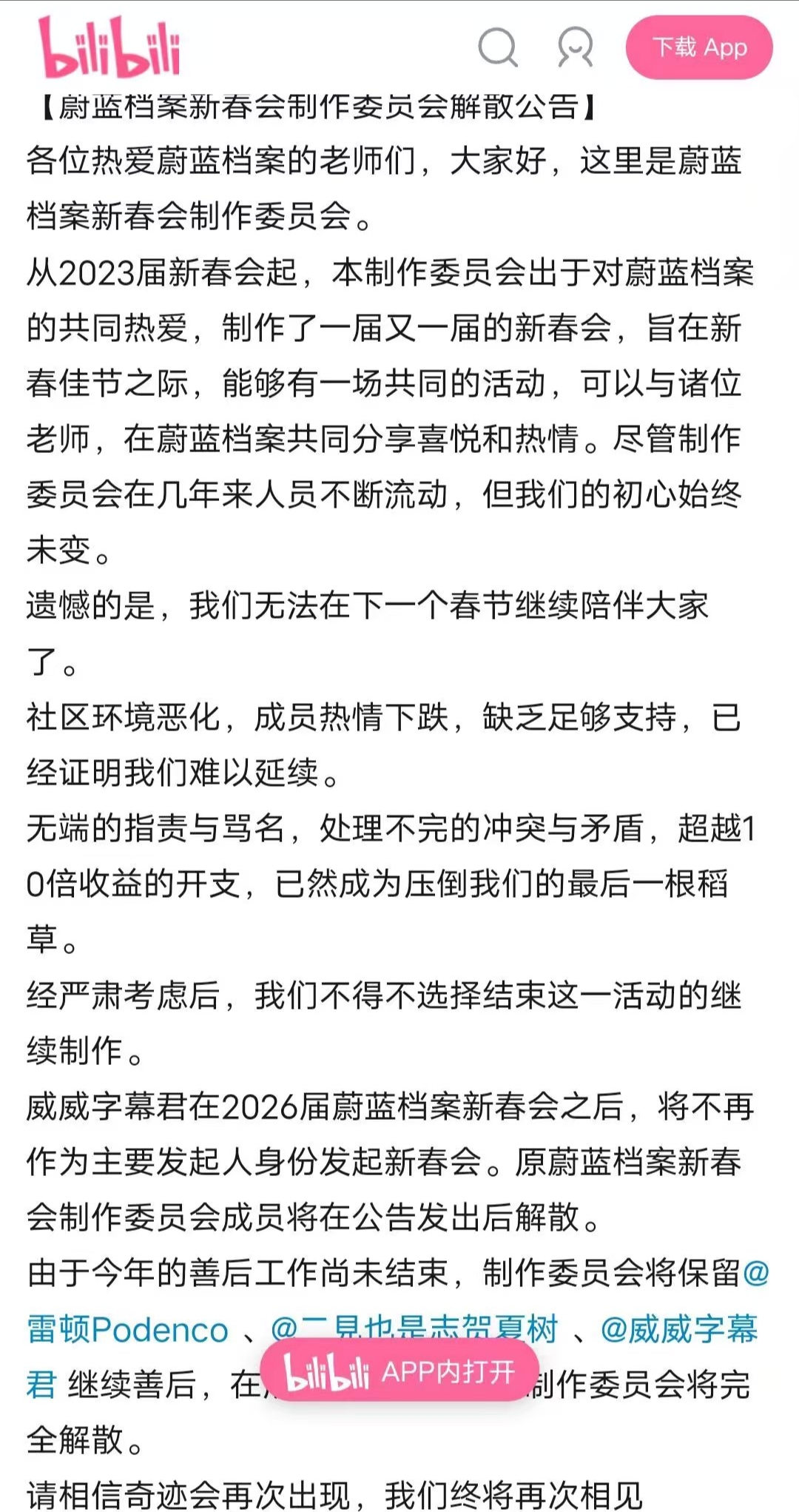 哔哩哔哩蔚蓝档案新春会制作委员会解散公告