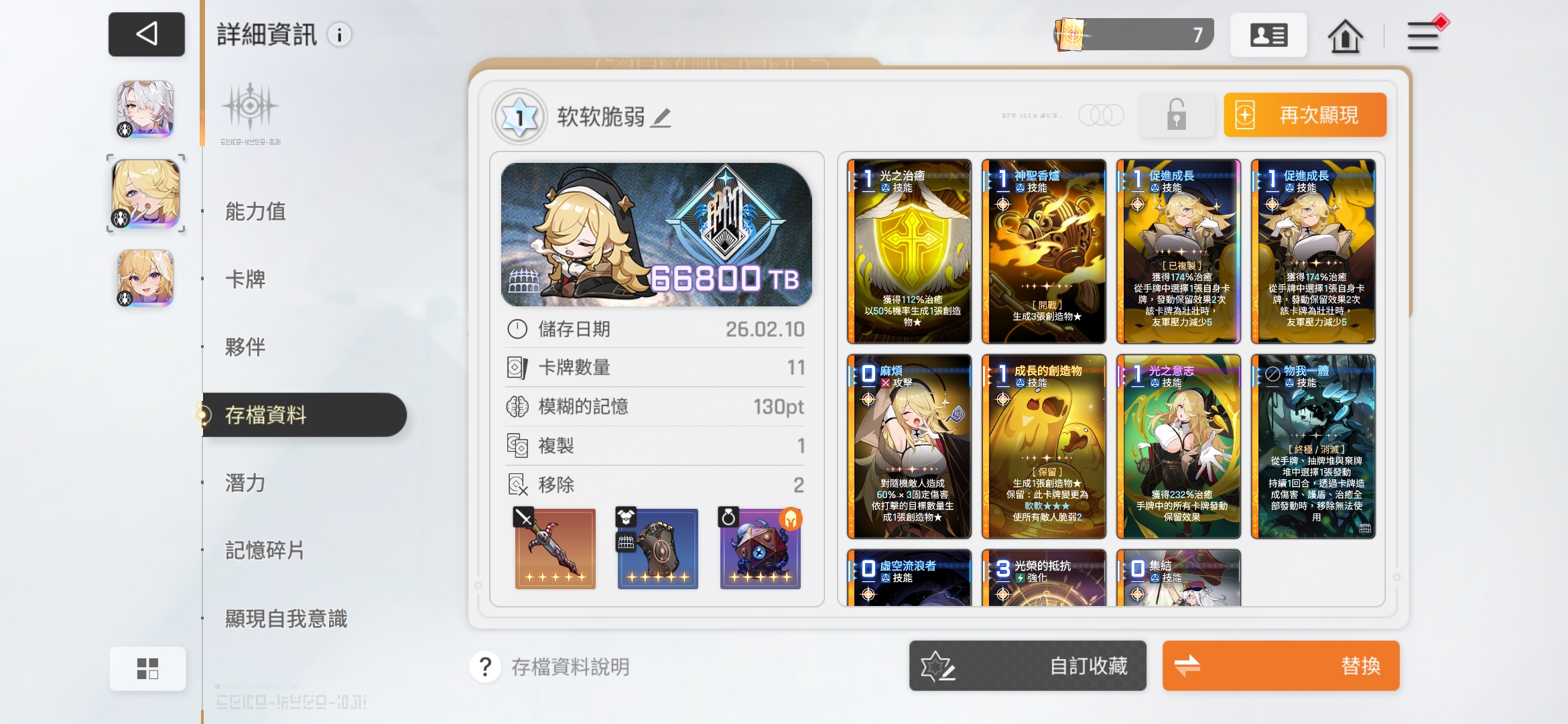 2.修女全程只管生崽儿和奶,攻击牌丢掉不留,省空间。这套卡组激活壮壮可以减压,全程0压,打又打不死,又不会爆压,可以在BOSS战前拖回合刷满三星软软和壮壮。