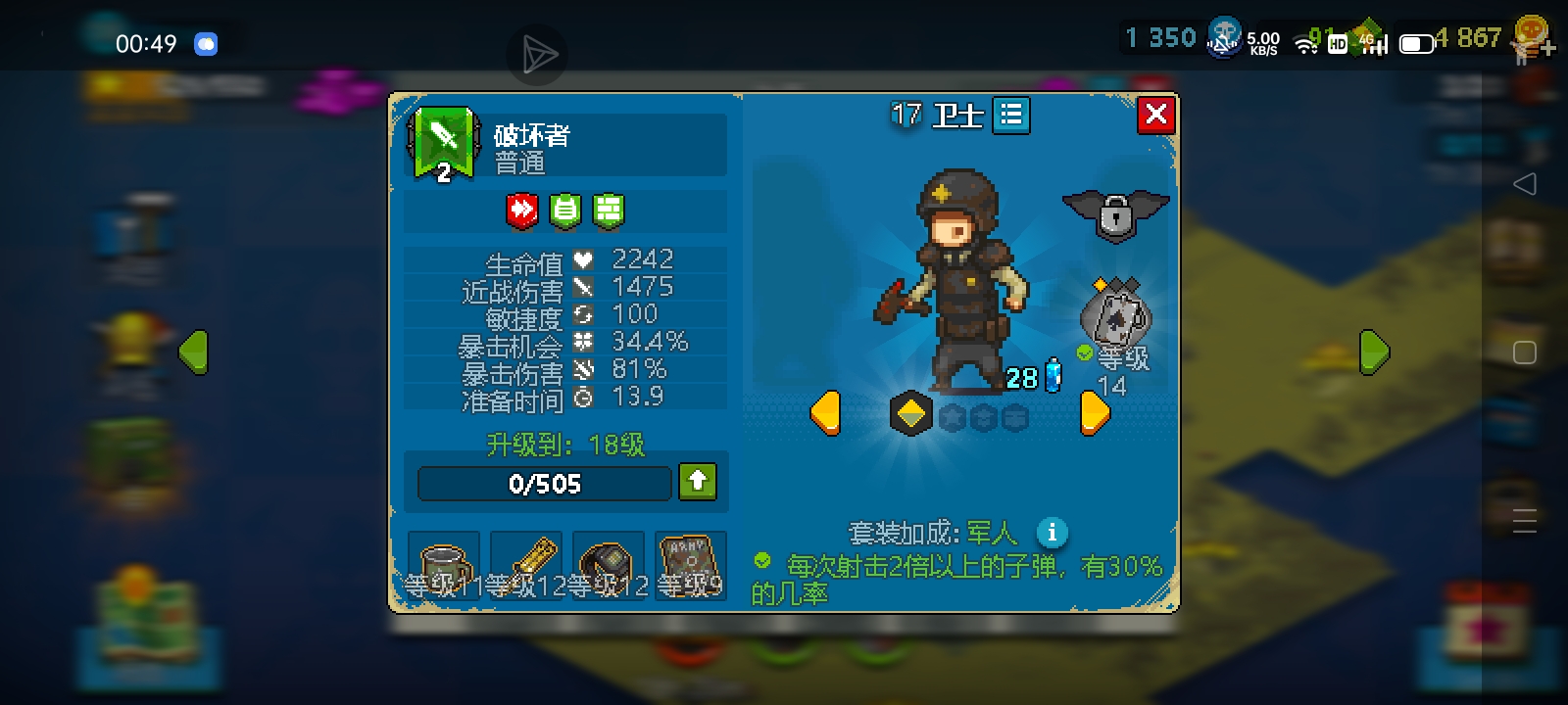 其实卫士,有点被官方搞废的样子(虽然之前地位不错,但轻兵被加强后除了CD,各方面都比不过轻兵,更别说勋章还被改成了加伤害) 另外更新后卫士费用还被加了(他的好同事威利降费了) 而且狱卒特效太烂了(除了一级) 所以卫士的话没事别碰(如果你不着急推图的话就没啥😅)