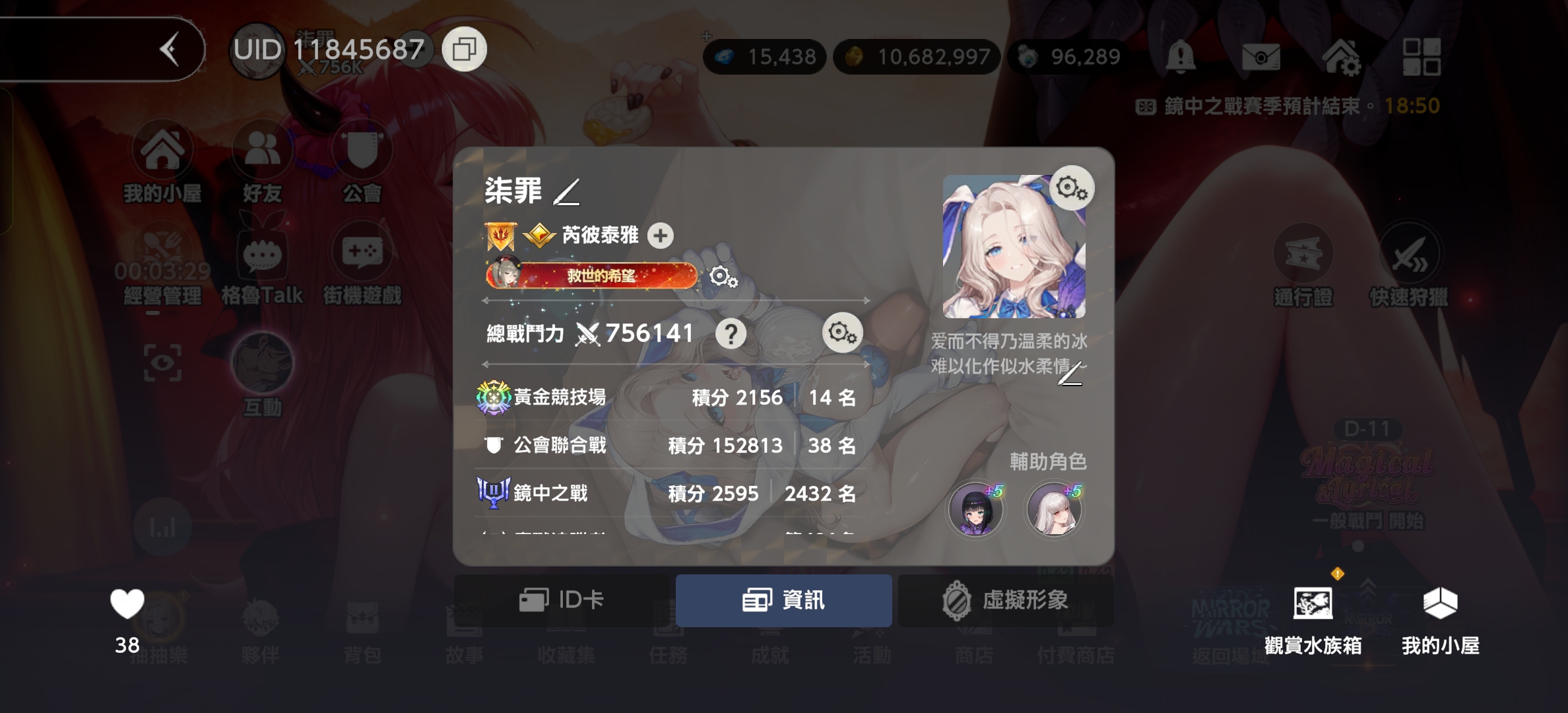 本来是754k,自从进了前排公会卷会战后,资源紧缺,分解掉了所有高级及以下的制造装备,一下子掉到660K,甚至还为了水晶把四星三星的ur专武全分了,时隔多日,现在又回到这个战力(涨了一点),想想还真是不容易……