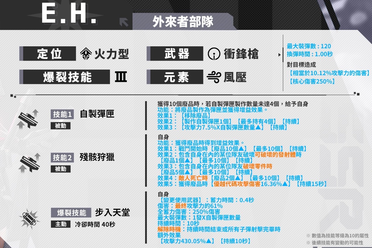 数值虽然还行,但是全靠平A输出,没有任何平A之外的伤害,甚至连一点溅射伤害都没有,武器还是最捞的冲锋枪,注定无法成为顶级大C