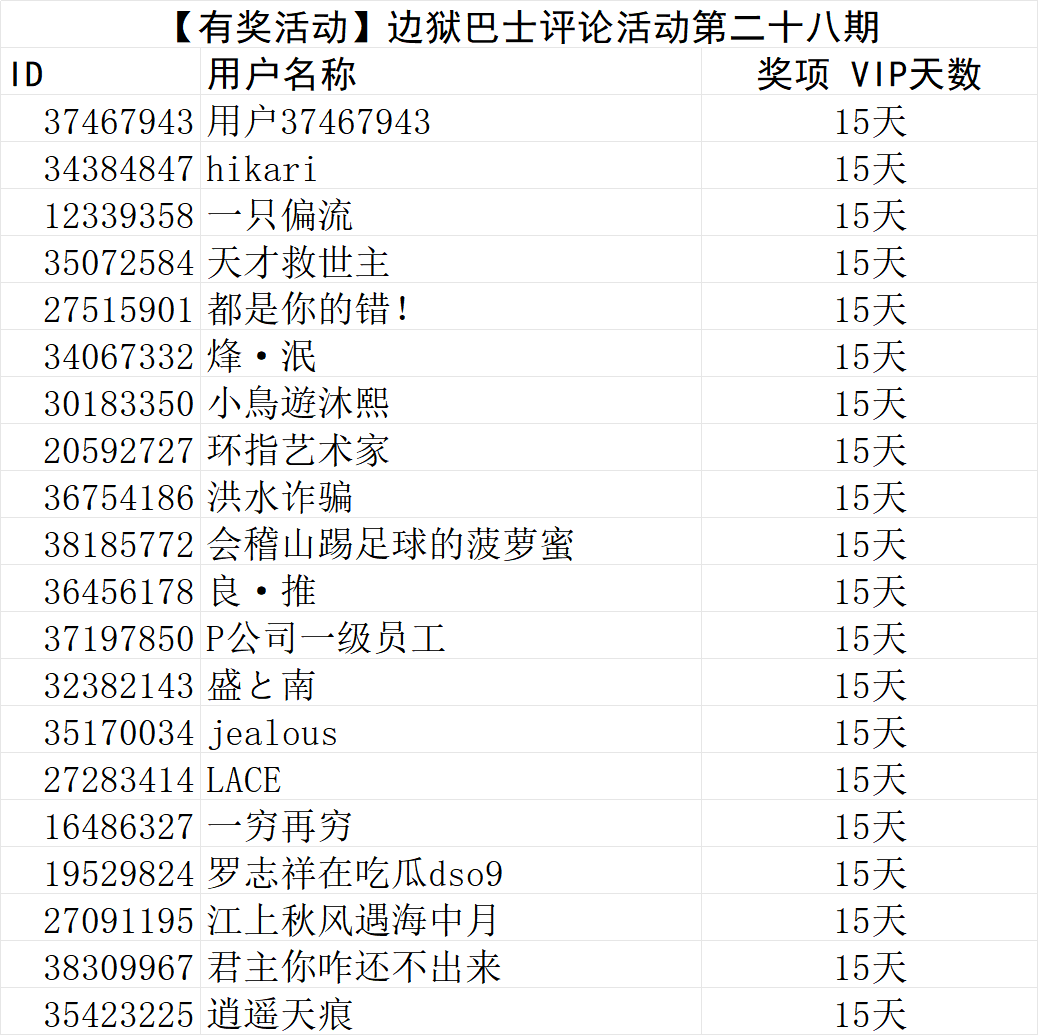 【获奖名单】边狱巴士评论活动第二十八期