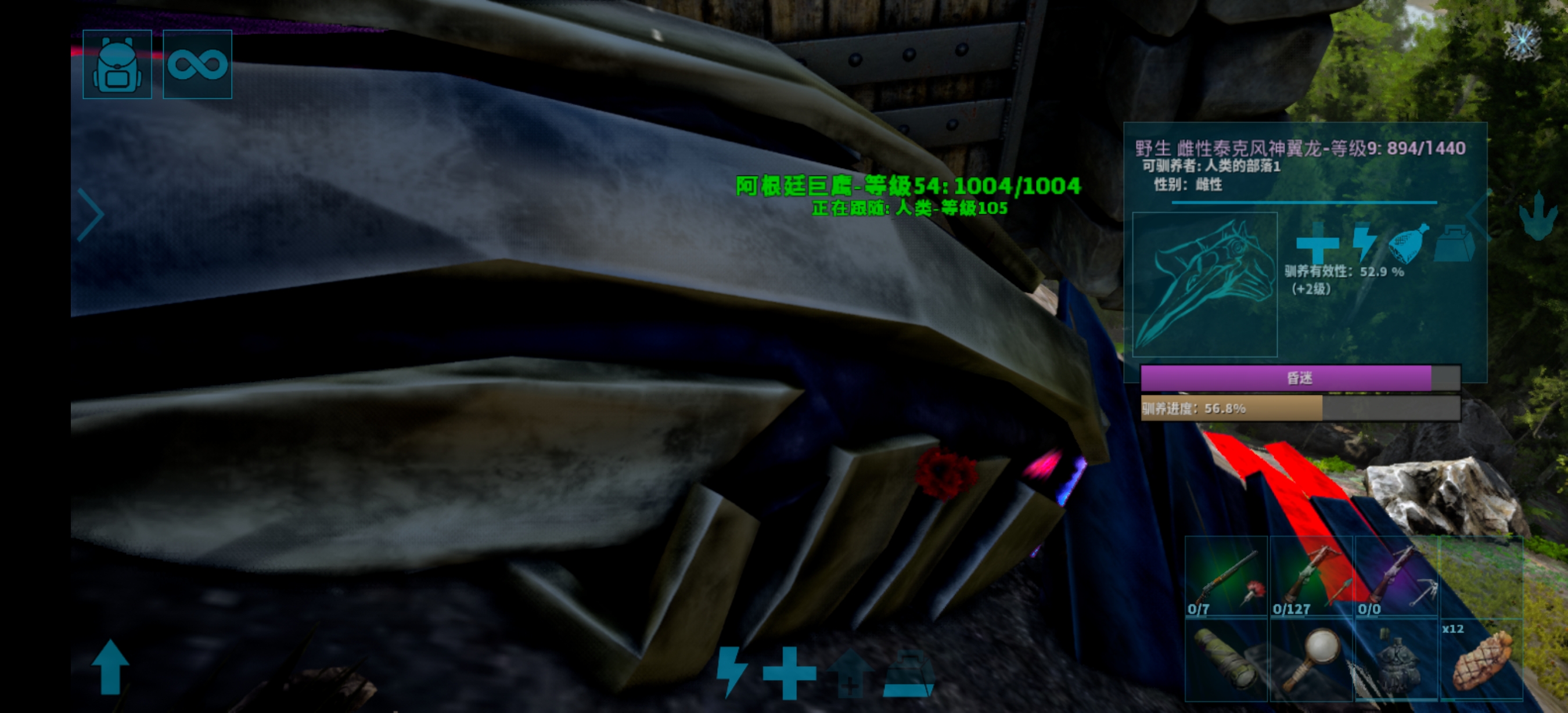 把霸王龙击杀,拖到他面前,松下霸王龙,立即离开。等他吃完霸王龙,看头上有没有绿色的标记。如果有绿色的,可以直接骑上它。在绿色标记消失前,击杀别的生物能增加进度。到百分百就驯服了。驯服完之后他会把你摔下来,要制作鞍才能骑。