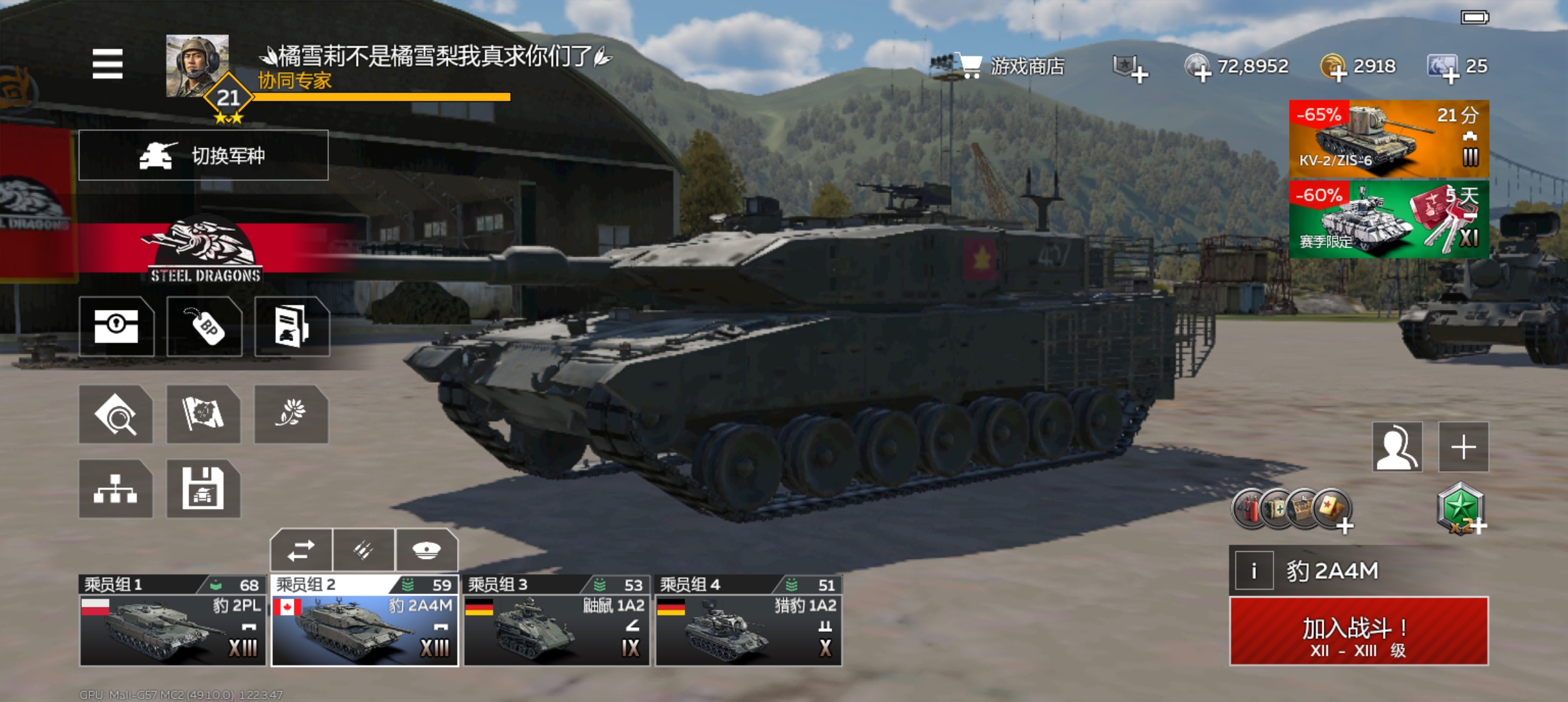 玩了两年了,一分没肝,这是我所有的顶级坦克了!