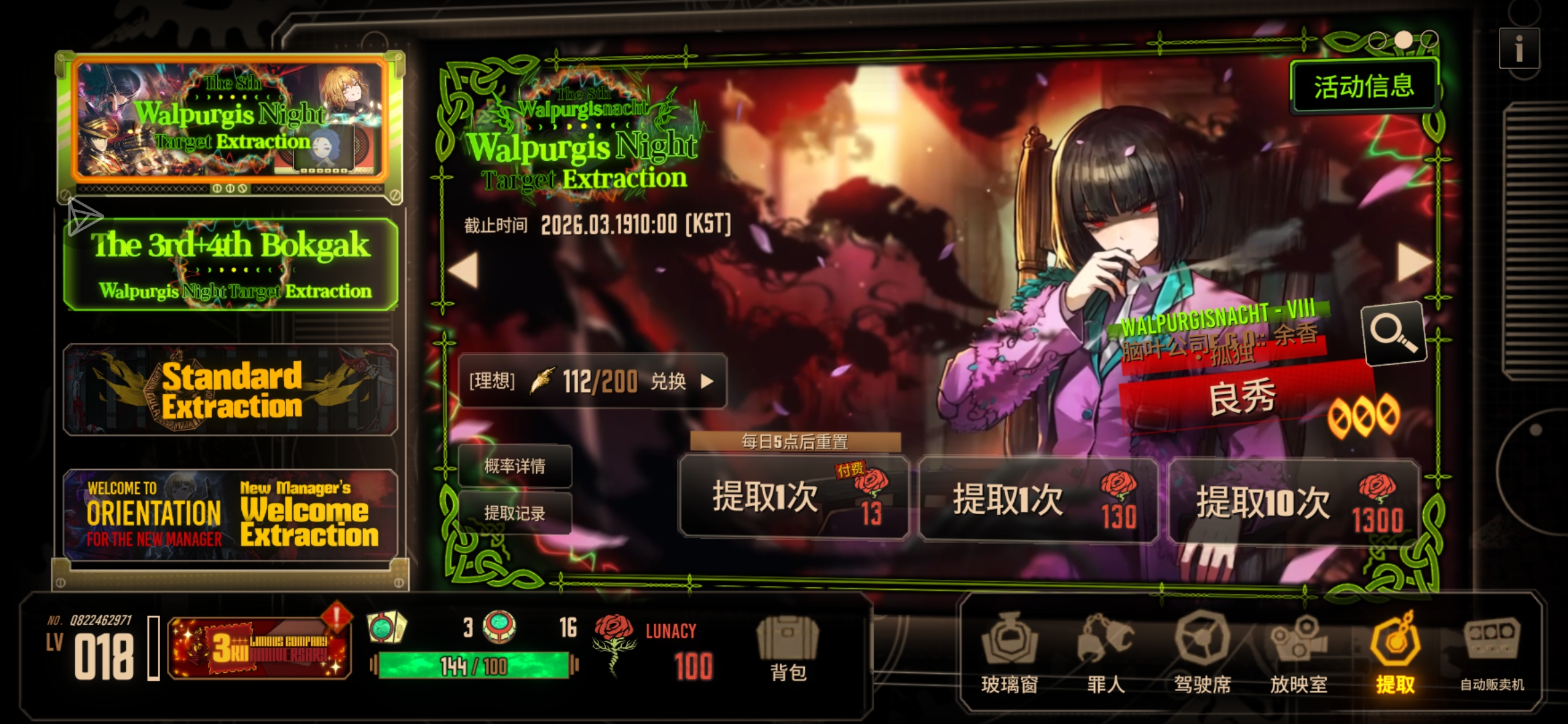 第一张是刷的初始号样子本来一个三灯券三个十连出了两个瓦夜觉得稳了,结果后面到112了一次绿光都没有