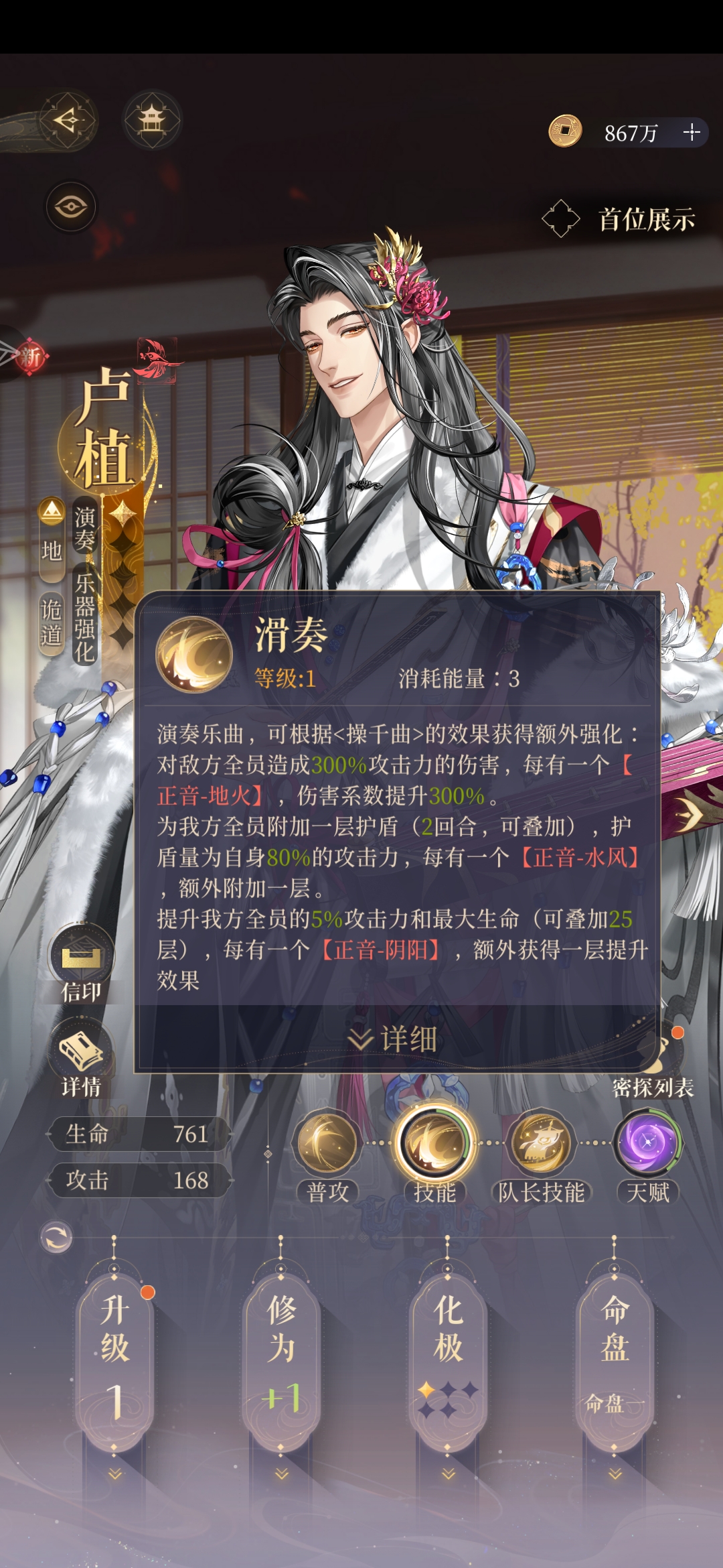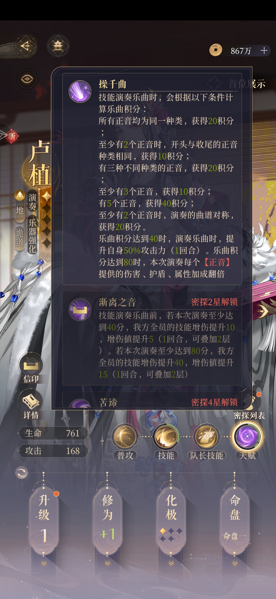 目前出的携带乐器的密探已经足够卢植两回合一个大了,再加上大招自身攻击力的百分之八十的盾,这个队不需要生存位了,不过演奏到100分刚需黄月英,他那个加成叠起来属于伤害越堆越多的,二星给的也超多