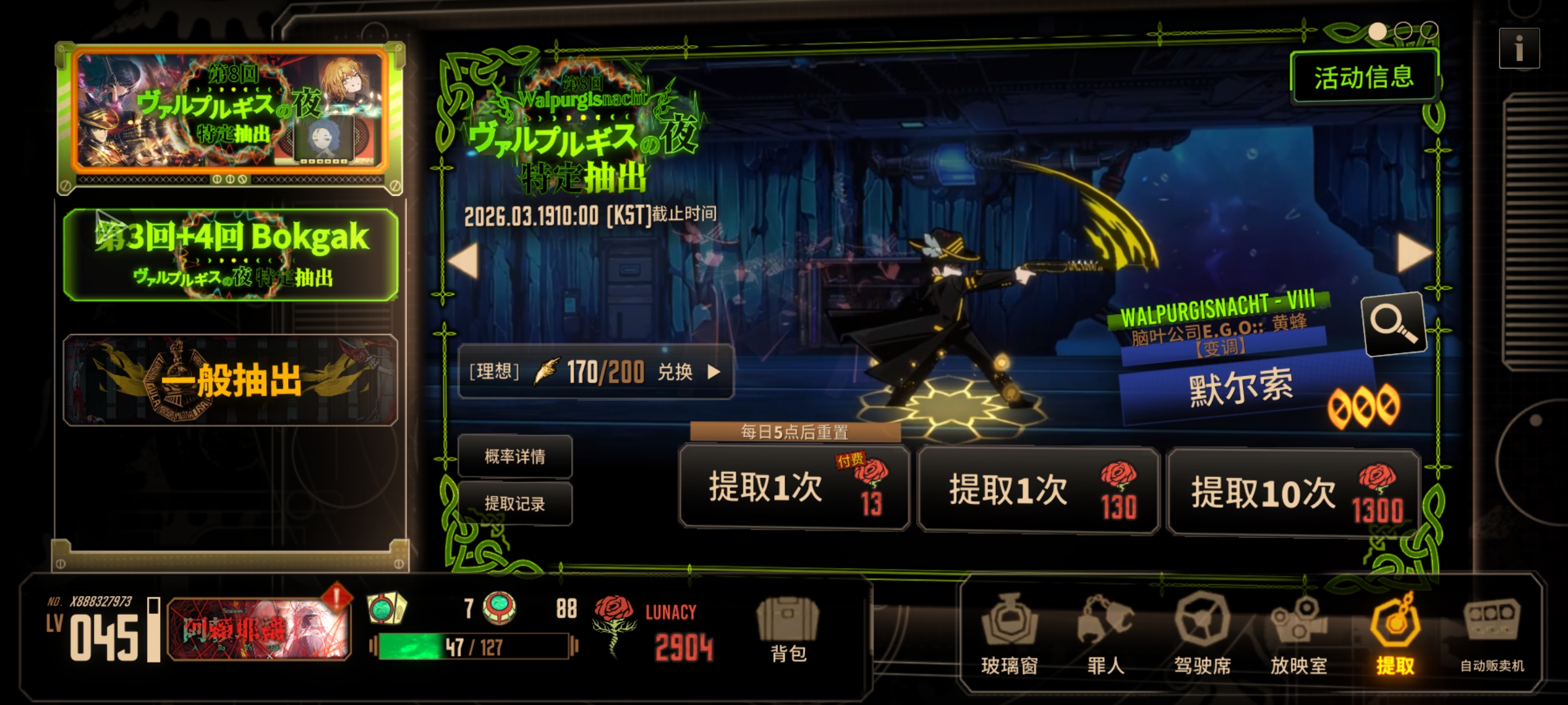 170抽才出黄默,前面40抽出花孤良,之后是魔弹ego,憎恶ego,tatb播报,咖啡杯播报,能刷的都打了,剩下的是付费花