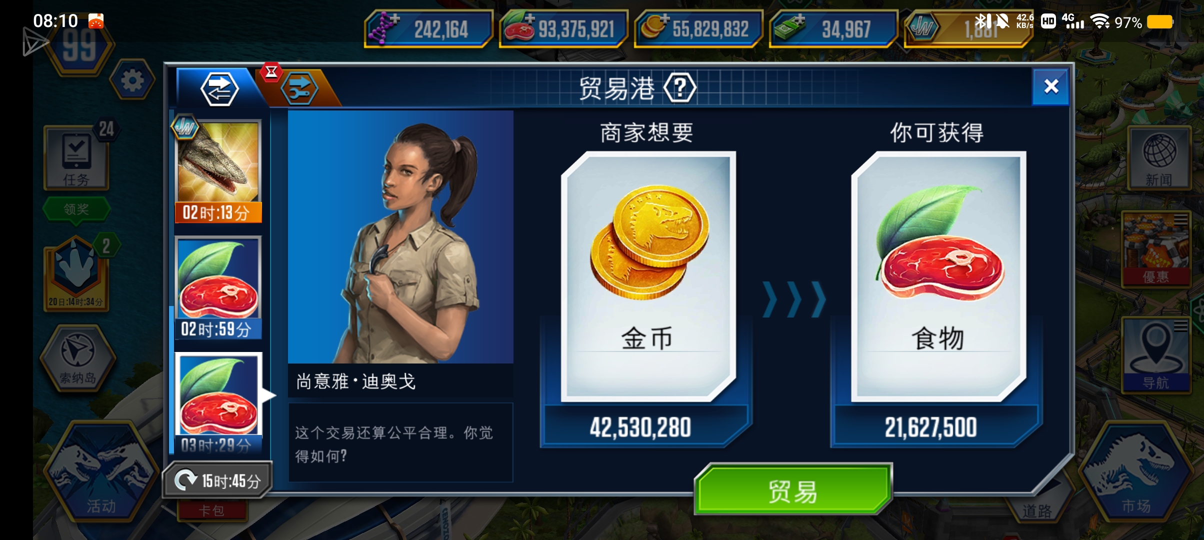 难评,一大早给我刷了两个金币换🥩的贸易,差不多10kw金币换了490w的🥩