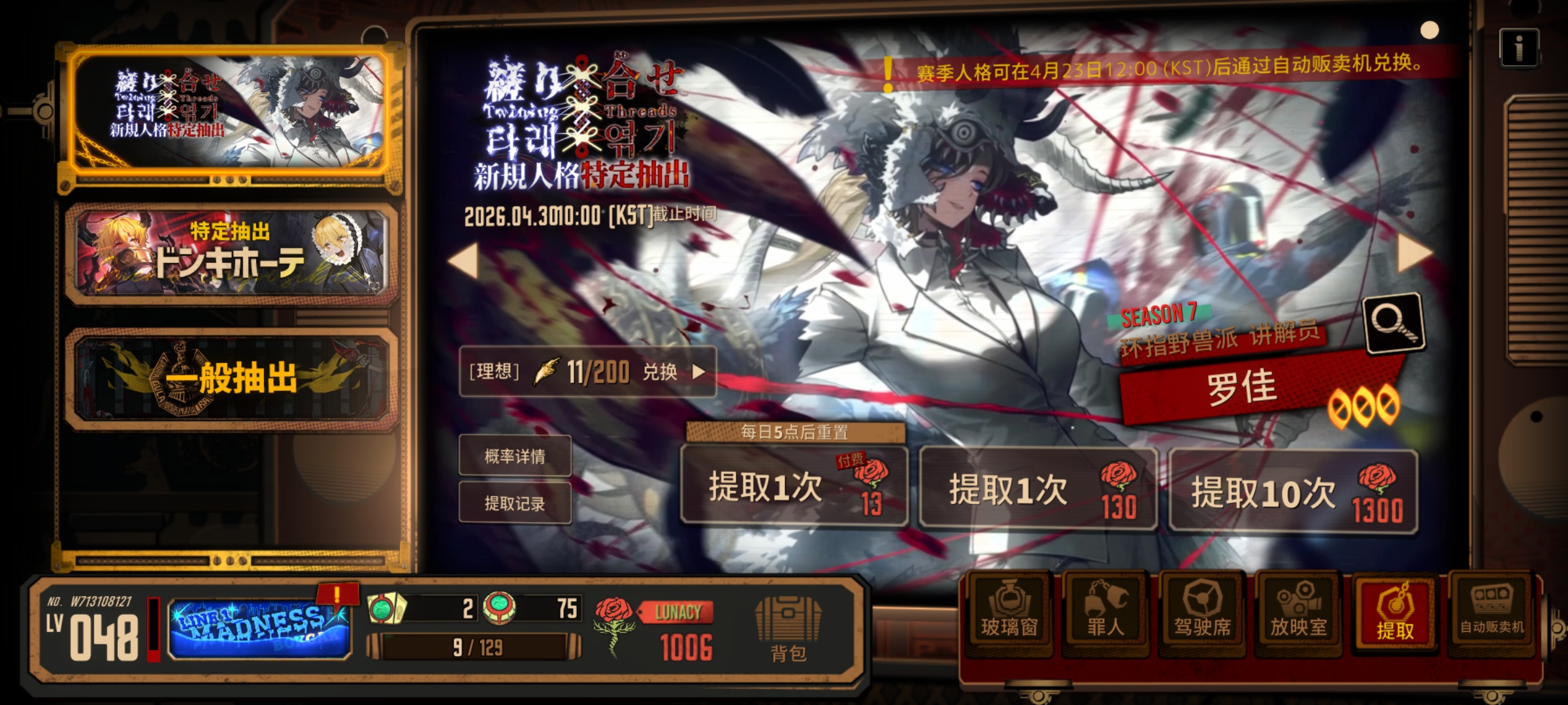 自打玩以来,最少的一次63才出个池子的人格,上次瓦夜更是170抽没出货😭