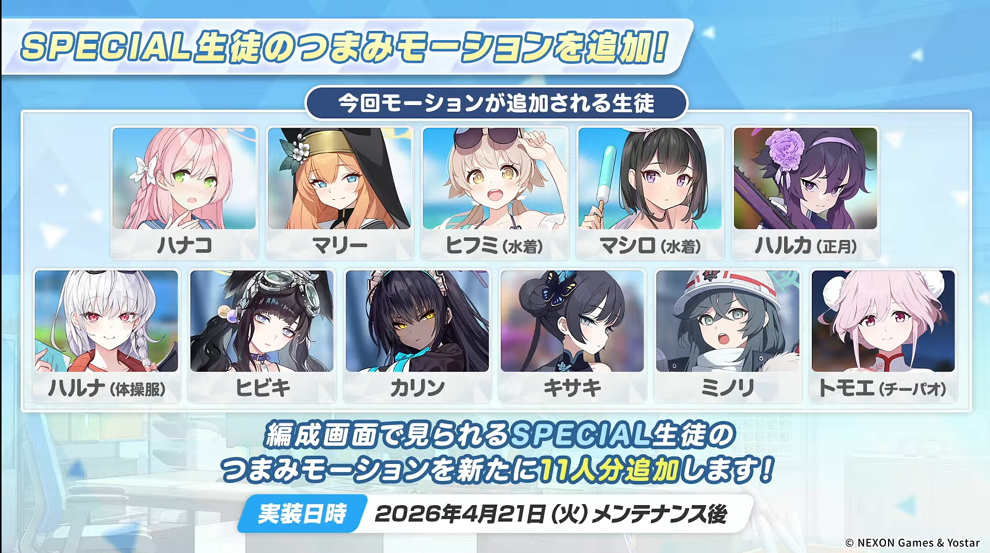 「UI改变」、「学生介绍新增成员好感礼物喜好」、「新增支援位成员部队选择动作」、「特别委托奖励掉落大福增加」、「新增万能设计图」、「新增模拟总力战」等。