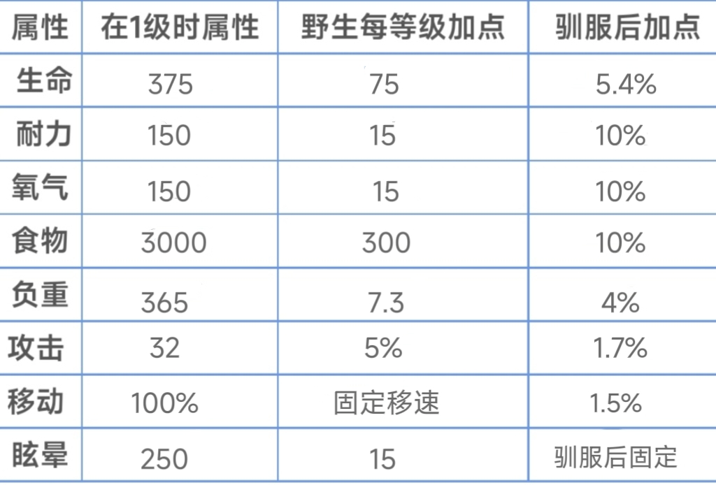 三角龙一定是前期对你帮助最大的宠物之一。它的战斗能力相较于野生三角龙强悍的多,即使是体型庞大的霸王龙,通过高攻速也可以无伤击杀(前提是耐力足够,耐力耗尽攻速会降低)。对付迅猛龙和镰刀龙要把握好攻击节奏,否则有概率翻车。三角龙的普通攻击可以采集大量茅草和少量木头,以及浆果。三角龙的蓄力冲锋是辅助攻击1,与野生不同的是需要刨地8次才能使用,且蓄力期间无法行动。受到中型生物的击退效果时蓄力会被打断。冲锋在撞到中型生物或石头后直接结束,如果只是蹭到则不会结束,但也会造成伤害和减速。冲锋期间撞倒的树,蹭到的石头和生物越多,冲锋时间就越短,在不碰到任何物体的情况下,最多可以消耗300耐力冲刺100米左右,摧毁路上所有树木并获取大量茅草、木头,无法获得浆果。这个技能一般不用于战斗或赶路。由于三角龙基础耐力低移速慢,赶路时一般让其在后跟随而不骑乘。